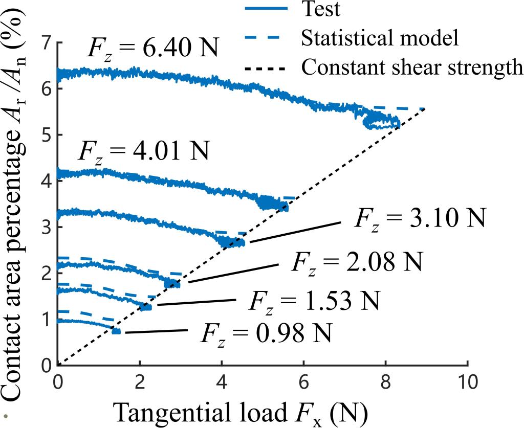 2018年,Sahli等(Sahli et al., PNAS. 2018, 115: 471–476)精准测量了一个用软物质(PDMS)制作的粗糙表面与一块刚性玻璃之间的实际接触面积随摩擦力的变化趋势,首次发现当两个接触面在切向方向上发生整体滑移前,实际接触面积随摩擦力的增大而呈抛物线递减,实验结果如图2实线所示。