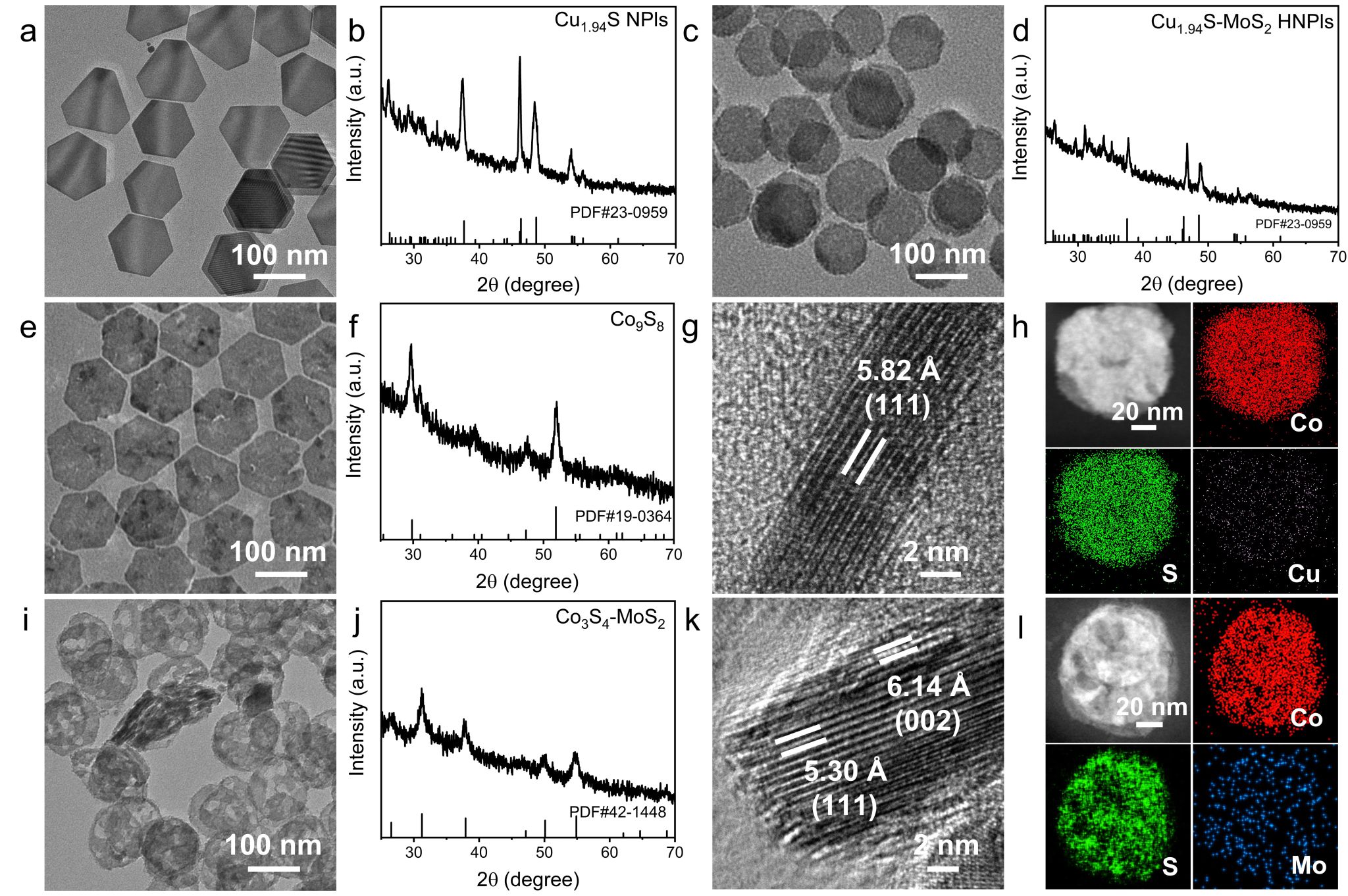 图1:Cu1.94S纳米片和Cu1.94S-MoS2异质纳米片与Co2+在140oC时进行阳离子交换