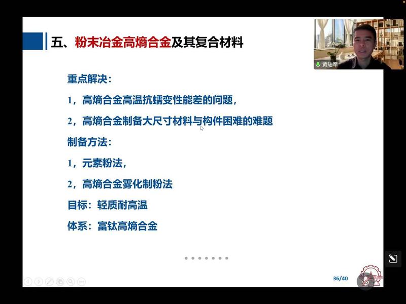 报告中黄陆军教授强调当前钛基复合材料所面临的挑战,即微纳尺度增强,并表示目前已知的最强增强相是硼化钛晶须,它通过与钛物理化学相作用达到强化效果。针对这一理论,黄陆军教授解释为硼化钛尺度单一、均匀分布,是一种软相包围硬相结构,通过牺牲塑性,从而达到有限强化效果。报告在介绍粉末冶金高熵合金及其复合材料时指出目前面临的难题,即高熵合金高温抗蠕变性能差及制备大尺寸材料与构件,需优化其制备方法和健立完整的体系来应对。