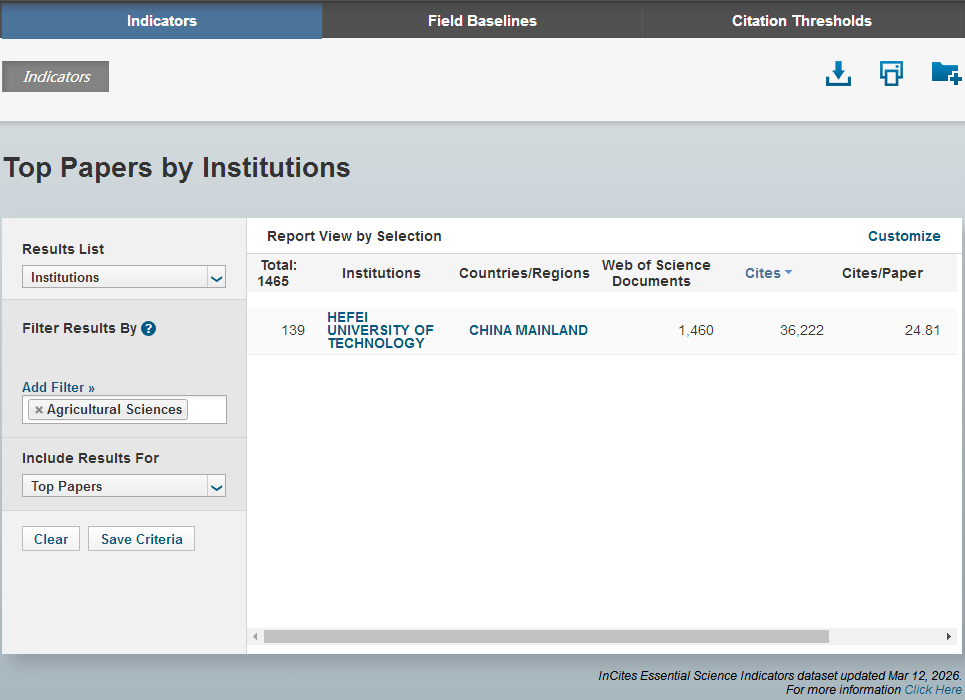 基本科学指标数据库是当今世界范围内普遍用以评价高校、学术机构、国家/地区国际学术水平及影响力的重要评价指标工具之一,其数据库每两个月更新一次,以学科分门别类(共分22个学科),采集面覆盖全球几万乃至十几万家不同研究单位的学科。本次数据的更新时间为2026年3月12日(数据覆盖时间2015.1.1-2025.12.31)。在本次统计周期内,学校农业科学学科累计发表论文1460篇,总被引36222次,篇均被引24.81次,科研影响力持续增强,学科在全球机构中排在第139位。