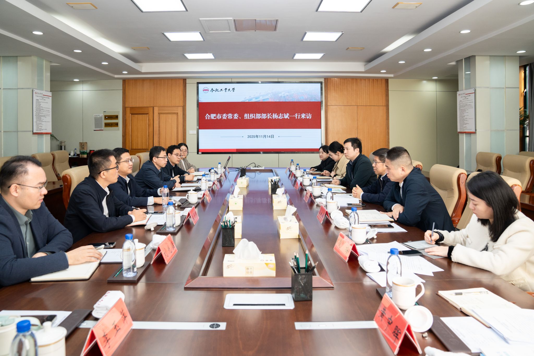 11月14日上午,合肥市委常委、组织部部长杨志斌一行来校,就进一步深化校地合作,共同推进高层次人才队伍建设等事宜进行调研座谈。校长汪萌,校党委副书记胡笑旋出席座谈会。