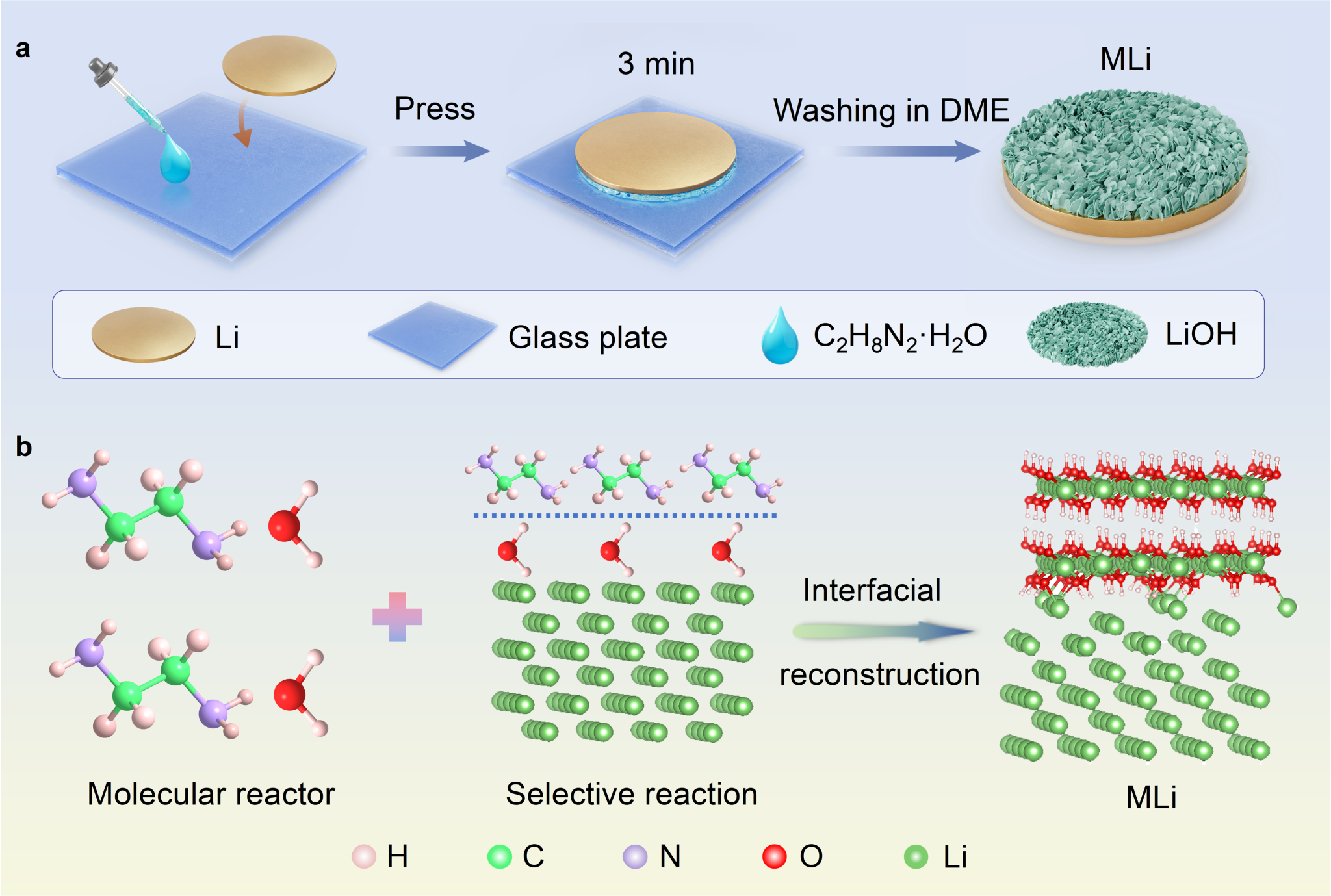 该研究首次提出了一种精准的“结合水分子化学金属锂负极界面调控策略”。利用一水合乙二胺分子(C2H8N2·H2O)与金属锂负极的选择性反应在金属锂负极表面原位构建了均匀、超薄、坚固、纵横交错且亲锂的LiOH纳米片界面层。由于LiOH层的超低电导率和丰富的离子传输通道,锂沉积发生在LiOH层下方,从而保护锂金属负极减少电解液的腐蚀。坚固(14 GPa)且纵横交错的LiOH纳米片犹如坚固的“铠甲”能够阻挡锂枝晶的不可控生长。具有亲锂性的LiOH层能够均化电极表面的Li+分布,并降低界面处的Li+扩散势垒,促进锂的均匀沉积。在多功能LiOH层的调节下,锂金属负极的问题得以解决。