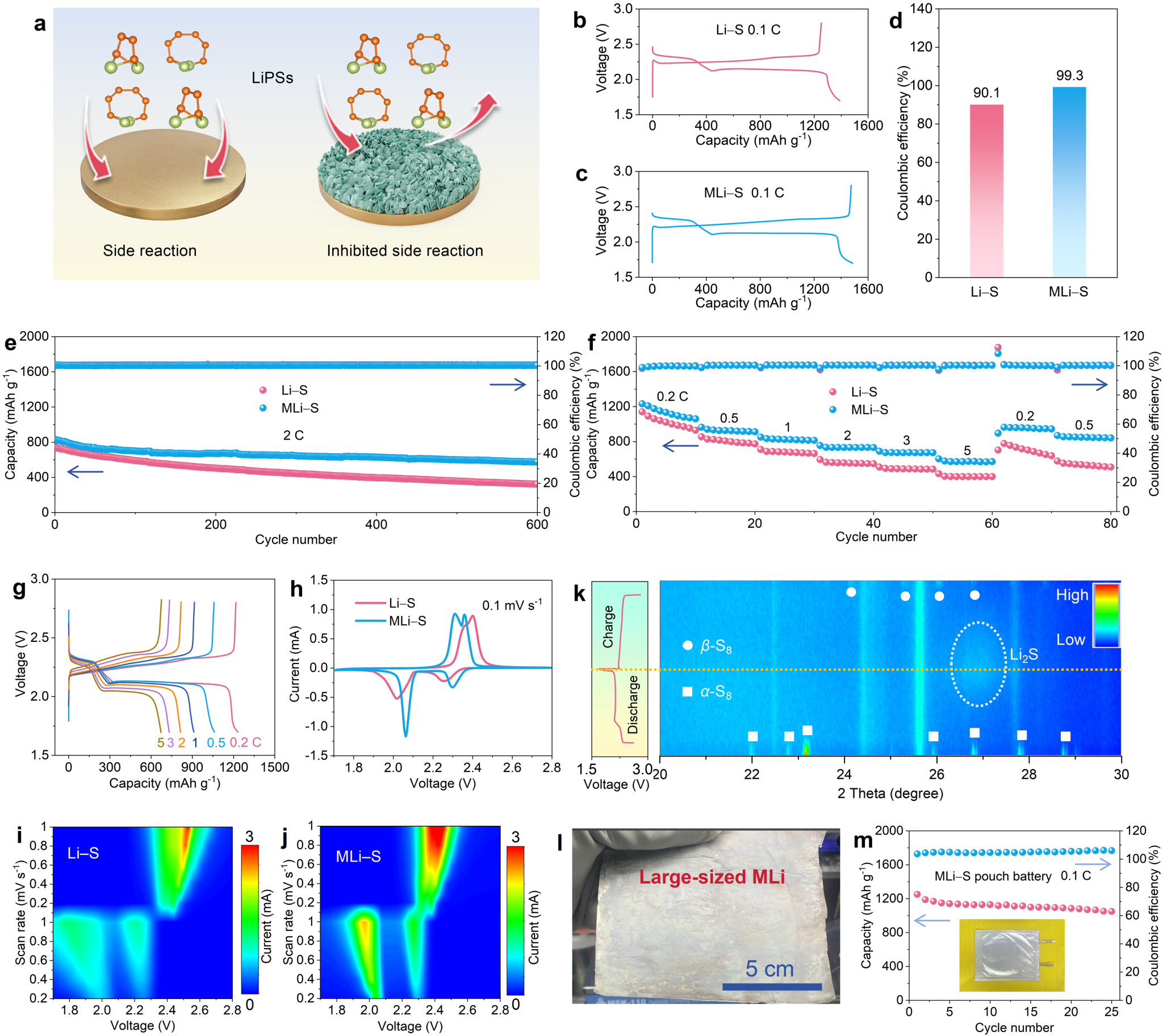 当用于锂硫电池时,C2H8N2·H2O 改性的锂(MLi)有效缓解了可溶性多硫化锂的侵蚀,锂金属负极和电池性能均显著提高。通过优化电解液的成分、界面反应时间、分子反应器的种类以及反应工艺技术,电池的性能可得到进一步提升。其它含结合水的分子可能具有相同的功能。此外,本研究提出的策略还可推广至其它金属负极(钠、钾、镁、锌等)。这些方面目前课题组正在进行系统研究,为锂金属负极及其它金属负极的改进提供了新的启示。