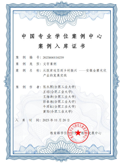 我院张本照教授为首席专家的“光伏产业扶贫照亮乡村绿色振兴之路——安徽金寨县的实践” 主题案例获准立项后,学院王琼、王海涛两位老师、六位金融专业研究生参与案例开发,经过近两年的努力,共开发出“从脱贫攻坚到乡村振兴--安徽金寨光伏产业的发展实践”(文字案例)、“PPP模式畅通金寨县光伏产业可持续发展之路”(小微案例)、“光伏产业扶贫照亮乡村振兴之路”(视频案例)三项案例成果,该三项案例成果全部收录“中国专业学位案例中心”案例库。