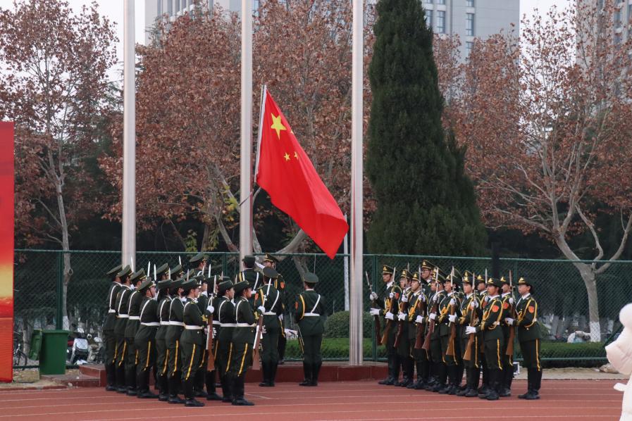 清晨的晨曦穿透薄雾洒遍校园,校大学生国旗护卫队迈着铿锵有力的步伐,在晨光中护送五星红旗稳步走向升旗台。雄壮激昂的《义勇军进行曲》奏响,鲜艳的五星红旗在全体师生的注目下徐徐升起。在场师生肃立致敬,目光紧紧追随着飘扬的国旗,嘹亮的国歌声在校园上空久久回荡。