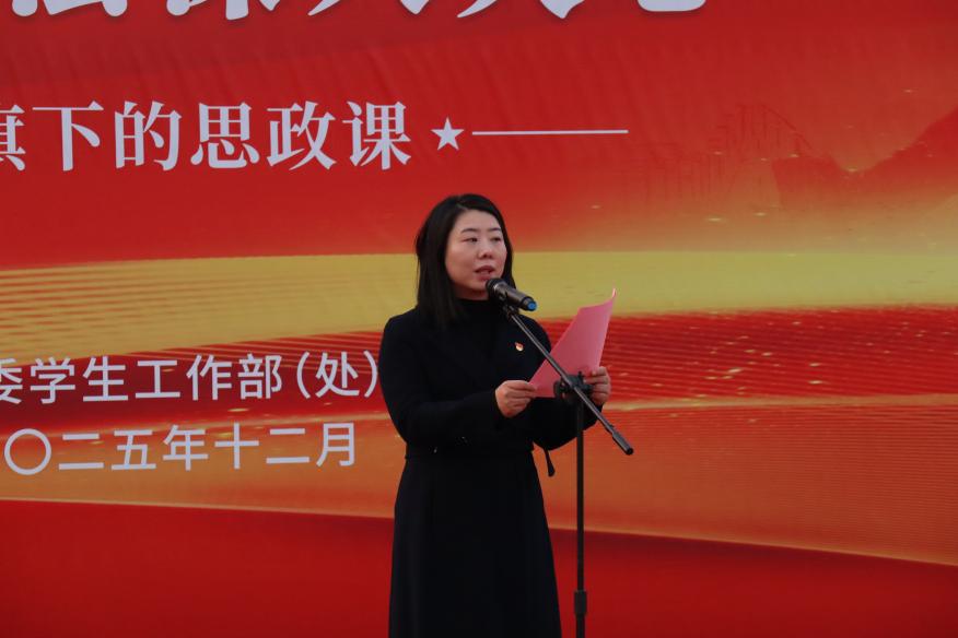 最后,马克思主义学院党委副书记兼纪委书记黄晨为师生开讲国旗下的思政课。她以习近平法治思想为根本指引,深入阐释法治思想核心要义与宪法精神内涵,引导师生牢固树立法治信仰、自觉践行宪法要求,鼓励青年学子勇担法治建设的青春责任。课程中,黄晨将法治要求与学校“厚德、笃学、崇实、尚新”的校训紧密结合,把青年成长与“工业报国、科教兴邦”的使命深度联结,为青年学子如何以法治素养护航成长、以青春力量助力法治中国建设提供了清晰方向。她还勉励师生将法治精神内化于心、外化于行,在日常学习与工作中践行法治担当,让法治成为青春最坚实的底色。