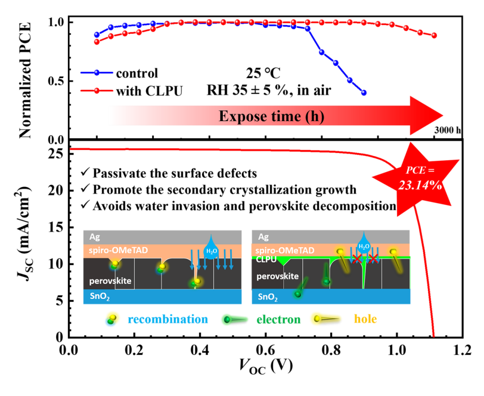 研究团队将交联聚氨酯前驱体溶液旋涂到钙钛矿层上,其自发交联形成多功能界面层,这种界面后处理可以诱导钙钛矿薄膜的二次结晶。同时,因为交联聚氨酯分子链中存在多个含N和O的官能团,可作为路易斯碱为未配位的Pb2+提供孤对电子,有效地减少了钙钛矿薄膜的非辐射复合中心,改善了电池的光伏性能。通过这种策略,制备了具有优异重复性的Cs0.05FA0.95PbI3太阳能电池。电池的开路电压为1.11 V,短路电流密度为25.69 mA/cm2,填充因子为0.81,光电转换效率达到23.14%。此外,交联聚氨酯可以阻止水分子透过空穴传输层破坏钙钛矿层,未封装的器件在35%的相对湿度下仍能稳定运行3000小时,显示出优异的稳定性。这项研究为设计高性能和高稳定性的钙钛矿太阳能电池提供了新思路。