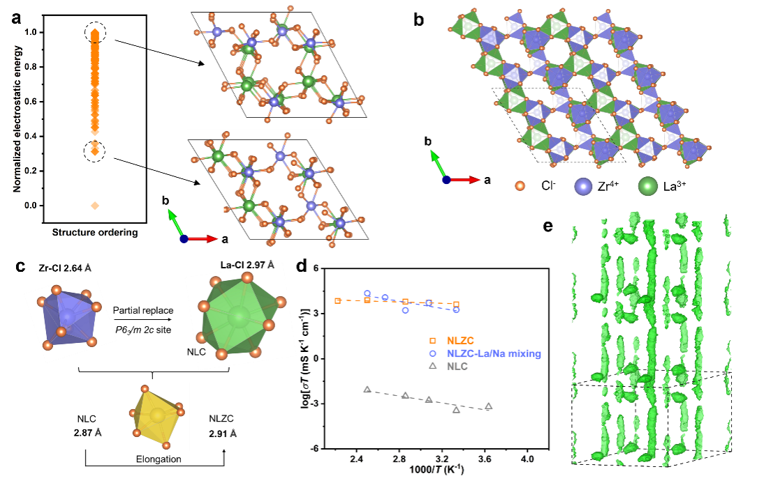 固态电池具有本征高安全性和高能量密度优势,是目前电化学储能领域的研究热点,而固态电解质是固态电池的关键材料。离子在固体中的快速传导是固态电解质材料设计的核心要求。固体中的离子传导速率普遍较低,是限制固态电解质材料和全固态电池发展的关键难题。我校项宏发教授团队基于快离子导体结构特征分析,构造载流子共面分布能实现较短的离子迁移和较低的迁移活化能,是实现高离子电导率的重要方法。通过筛选具有Na+共面结构的LaCl3基材料(NaLaCl4),引入Zr4+离子掺杂调控Na+迁移通道大小,从而制备出具有高离子电导率的新型钠离子卤化物固态电解质Na0.7Zr0.3La0.7Cl4。进一步结合分子动力学模拟、X射线吸收精细结构谱等对其精细结构和离子传导机制进行分析,验证了共面结构和离子迁移通道大小对离子传导速率的影响。该成果为新型高性能固态电解质的设计与制备提供了理论依据和重要实例。