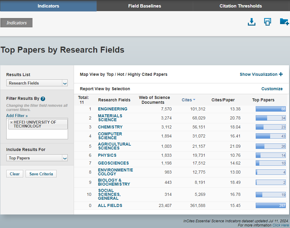 基本科学指标数据库是当今世界范围内普遍用以评价高校、学术机构、国家/地区国际学术水平及影响力的重要评价指标工具之一,其数据库每两个月更新一次,共分22个学科,采集面覆盖全球几万乃至十几万家不同研究单位的学科,本次数据的更新时间为2024年7月11日(数据覆盖时间为2014.01.01—2024.02.29)。