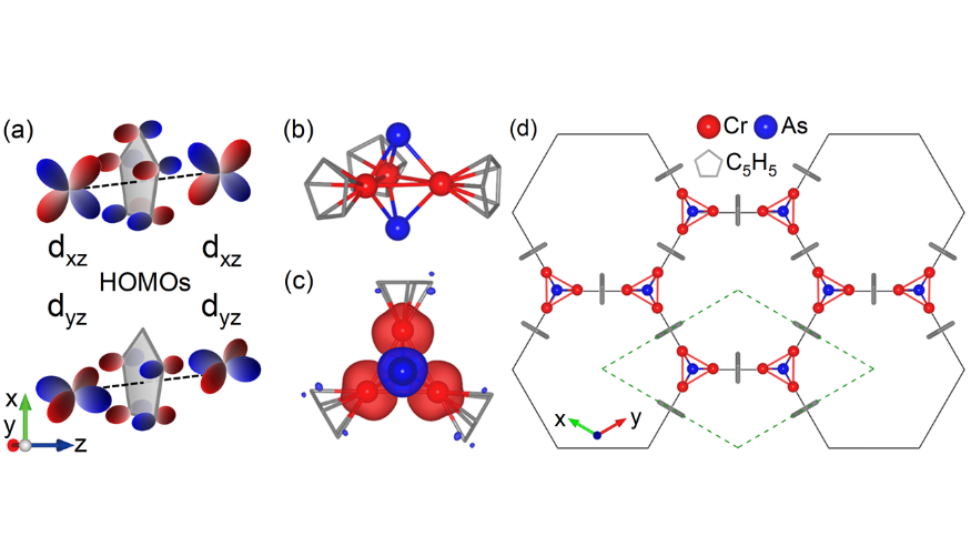 为了突破上述限制,研究团队提出使用环戊二烯基(Cp)作为p轨道的主体,基于团簇自组装概念,构建了一类二维磁性(Cr3As2)2Cp3团簇类烯,如图1所示。根据分子理论,由于Cp的两个简并的最高占据分子轨道和dxz/yz轨道属于同一种不可约表示(E′′)基函数,dxz/yz(|Lz|=1)轨道可以与Cp的最高占据分子轨道发生巨大重叠,增强d-p-d超交换相互作用。另一方面,d轨道与Cp的最高占据分子轨道之间的强相互作用可增强d电子离域化程度,使dxz/yz能量提升至费米能级附近,实现自旋极化的价带和导带的磁量子数匹配(|∆Lz|=0)。