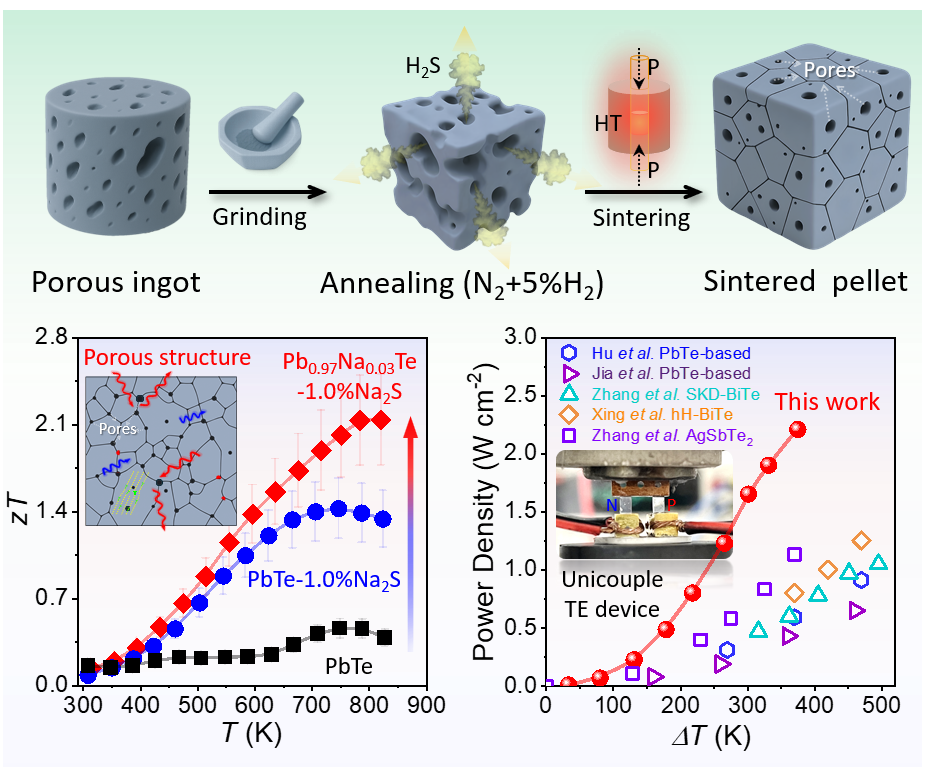 图1.Na2S协同设计多孔PbTe热电材料:工艺与机理示意、材料的热电性能,以及单对偶器件的功率密度及其与文献的对比。