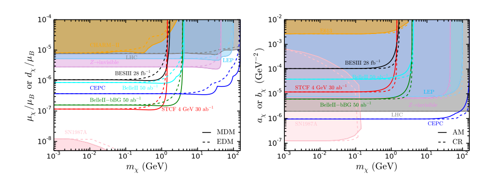 针对已经停止运行的位于欧洲核子中心(CERN)的大型正负电子对撞机(Large Electron Positron Collider, LEP)发布的数据结果、正在运行中的我国的北京正负电子对撞机II(Beijing Electron Positron Collider II, BEPCII)上的北京谱仪III实验(Beijing Spectrometer III, BESIII),和日本的SuperKEKB对撞机上的Belle II实验以及我国计划建造的超级陶粲装置(Super Tau Charm Facility, STCF)和环形正负电子对撞机(Circular Electron Positron Collider, CEPC),团队进行了详细的研究,展示出了各种不同类型的正负电子对撞机对于暗态粒子电磁形状因子的探测能力(见图2)。该工作发表于Phys.Rev.D 107 (2023) 055023,星空游戏官网app为论文的第一署名单位,物理学院张宇副教授为论文第一作者,中国科学院近代物理所陈良文副研究员为论文通讯作者。