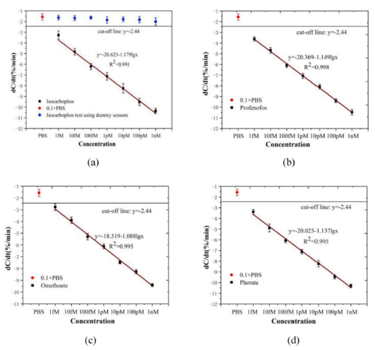 该工作基于DNA适配体修饰的微电极芯片,采用交流电热效应实现超痕量有机磷分子在芯片表面的富集,使传感器达到30秒钟快速响应。对四种常见有机磷的检测限(LOD)低至 (0.24-1.67) fM,并具有fM ~ nM的超宽线性范围,同时保持了良好的特异性和可存储性。论文还对实际蔬菜样品中的有机磷农残进行了有效检出。该传感器及其检测方法为现场广谱检测超痕量有机磷农残提供了一种先进、可靠、低成本的解决方案。
