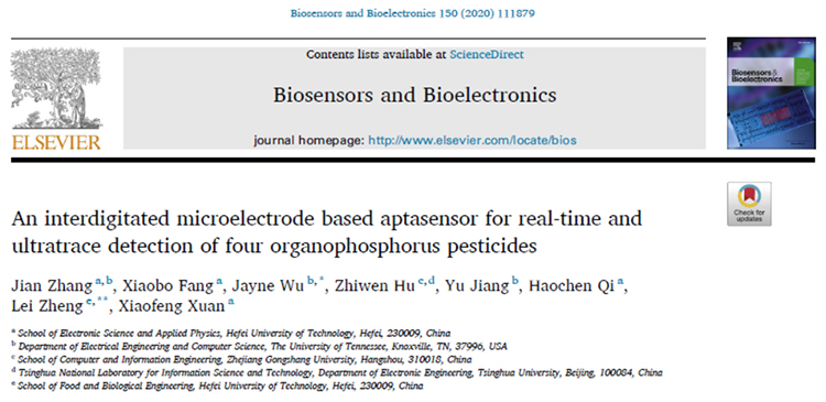 快速、广谱、痕量的农残检测是目前面临的一大全球性难题。我院张鉴副教授依托食品与生物工程学院郑磊研究员团队,成功研发出一种能实时检测四种超痕量有机磷农残的微型适体传感器,相关研究结果以“A micro interdigitated electrode based aptasensor for real-time and ultratrace detection of four organophosphorus pesticides”为题发表于Biosensors and Bioelectronics,张鉴副教授为论文第一作者,郑磊研究员为论文通讯作者,美国田纳西大学Jayne Wu教授为论文共同通讯作者,我院研究生方晓波、教师戚昊琛和宣晓峰为论文共同作者。星空游戏官网app为论文第一单位。