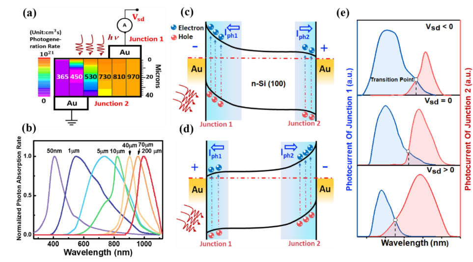 近日,我院先进半导体器件与光电集成实验室王莉副教授等人提出了一种具有紫外和近红外窄带探测能力的波长实时可调多光谱光电探测器。该器件由两个简单的Au/n-Si肖特基结构成(图1(a))。根据结控电荷收集窄化原理(JCCN),此器件的光谱响应不仅由光敏层的吸收特性决定,还受到肖特基结电荷收集特性的控制(图1(a-d))。研究结果显示在负偏压下可以实现在近红外光谱的窄带探测,在正偏压下可以实现在紫外光区的窄带探测(图1(e))。具体来说,当偏置电压从0.1 V变化到-0.1 V 时,器件的负响应峰值轻易地从 365 nm调整到 605 nm,正响应峰值可以从938 nm调整到970 nm(图2(a))。当负响应峰和正响应峰分别接近紫外短波端和近红外长波端时,探测峰的半峰宽缩小至92和117 nm(图2(b-c))。该器件仅采用传统的硅作为光敏材料,器件结构及制备工艺简单,在未来的多光谱探测领域具有重要的应用价值。
