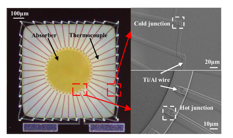 MEMS热电堆红外探测器在宽范围内进行非接触式、高灵敏度、非侵入式温度测量方面表现出色,无需冷却系统,使其成为智能传感应用的理想选择。文章在此背景下提出了一种利用径向分布的双层热电堆的微机械热电堆红外探测器,该探测器具有快速响应时间并显着提高响应性和检测性。双层热电偶阵列是通过在二氧化硅支撑层上径向分布 堆叠的N/P型多晶硅,并通过在硅衬底背面干蚀刻悬浮来实现的。