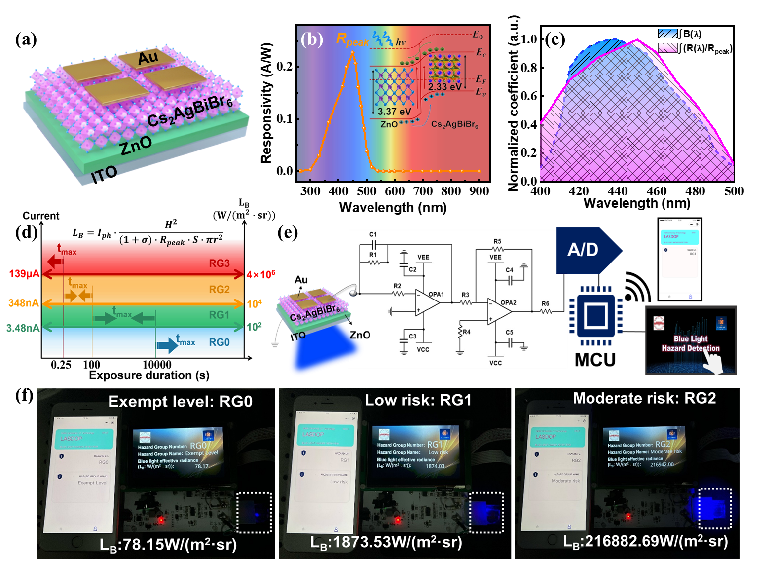 基于此,该研究团队近期提出了一种基于无铅双钙钛矿Cs2AgBiBr6的自驱动环境友好型蓝光危害检测系统。器件分析表明,在0偏压下,器件的响应度、外量子效率、比探测率和抑制比(450/510 nm)分别达到了0.327 A/W、89.9%、2.8×1010 Jones和28,这些卓越的性能参数为高精度蓝光危害检测提供了强有力的技术支撑。不仅如此,通过引入误差因子将蓝光危害加权函数替换成光电探测器的归一化响应度,成功得到了蓝光加权辐亮度与器件光电流之间的函数关系,从而实现了通过光电流对蓝光危害进行评估,并计算出了不同蓝光危害等级对应的阈值光电流。最后,对蓝光危害检测系统进行模块化设计并集成,最终实现了环境友好型便携式蓝光危害检测系统。该研究工作于2024年4月以“A Sensitive Lead-Free Perovskite Photodetector for Self-Powered Blue Light Hazard Detection Application”为题发表在IEEE Electron Device Letters,我院硕士研究生安翔为论文第一作者,张祥老师和罗林保教授为通讯作者,星空游戏官网app为第一署名单位,澳大利亚南昆士兰大学为合作单位。该研究工作得到了国家自然科学基金、安徽省重点研发计划和安徽省自然科学基金等项目的资助。