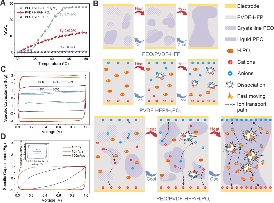 为此,研究团队结合热致相变机理与双电层电容原理,首次提出并制备了一种基于PEO/PVDF-HFP/H3PO4的高分辨电容式柔性温度传感器。通过调控相变材料结晶性能与离子运动特性,传感器在人体体温范围内具有极高的分辨力(0.05 ℃)与响应速度(<12 s)。同时,利用二维网孔结构实现传感器内结晶微域控制,提升传感器的稳定性与重复性(Ex<2.2%)。所研制的传感器被应用于人体体温监测与糖尿病足诊断中,可实现舒适的实时高精度体温测量与糖尿病足早期诊断。该研究为柔性温度传感器的设计提供了新思路,在健康监测、康复医学等领域具有广泛的应用前景。