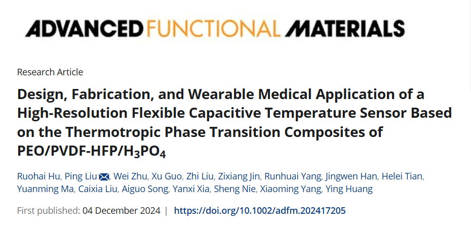 近日,我院微电子学院柔性传感技术与通用人工智能刘平副教授、黄英教授研究团队成功研发出一种基于热致相变机理的高分辨电容式柔性温度传感器。相关成果以“Design, fabrication, and wearable medical application of a high-resolution flexible capacitive temperature sensor based on the thermotropic phase transition composites of PEO/PVDF-HFP/H3PO4”为题,发表在国际著名学术期刊《Advanced Functional Materials》上。