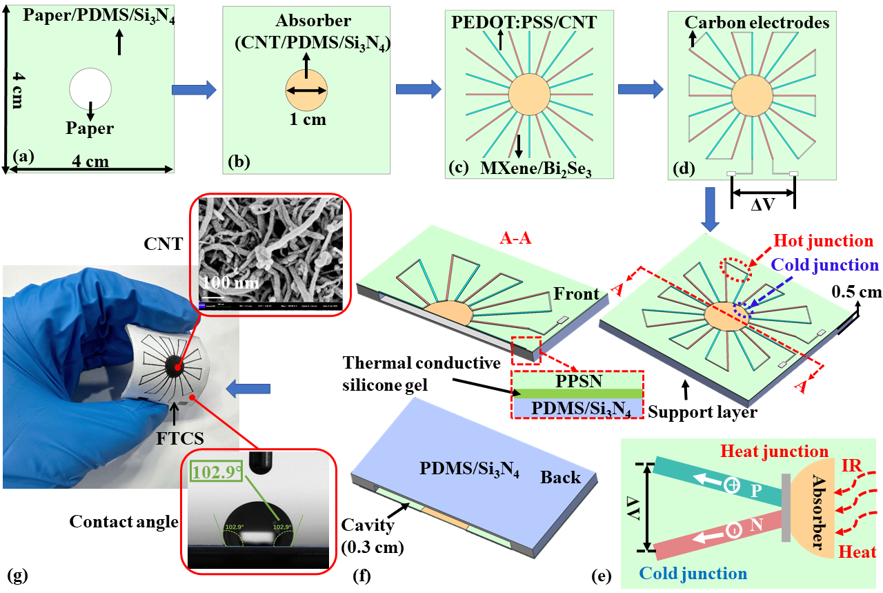 团队基于柔性热电偶传感器仅限于接触式监测温度的特性,提出了柔性双模式温度监测传感器。在温度传感领域,传统的柔性热电偶传感器由于聚合物材料的热电性能有限以及无机材料的固有刚性,常面临着灵活性和性能之间的权衡问题。针对这一难题,课题组提出了一种基于PEDOT:PSS/CNTs和MXene/Bi₂Se₃复合材料的柔性热电偶传感器(FTCS),该传感器采用了丝网印刷和压缩技术,应用于纸/PDMS/Si₃N₄(PPSN)复合基底上。研究表明,该传感器在接触模式下具有优异的温度灵敏度(379.5μV/°C)、宽广的检测范围(20-200°C)、高分辨率(约0.3°C)以及快速响应时间(约12.6ms)。在非接触模式下,传感器依旧展现了良好的性能,最大灵敏度为52.67μV/°C,响应时间更短(约9.8ms)。这项研究突破了柔性热电偶传感器的性能瓶颈,尤其在可穿戴设备和锂电池温度监测领域展现了重要应用潜力。该项成果以“Dual-mode temperature monitoring using high-performance flexible thermocouple sensors based on PEDOT:PSS/CNTs and MXene/Bi2Se3”为题于发表在《Microsystems & Nanoengineering》。