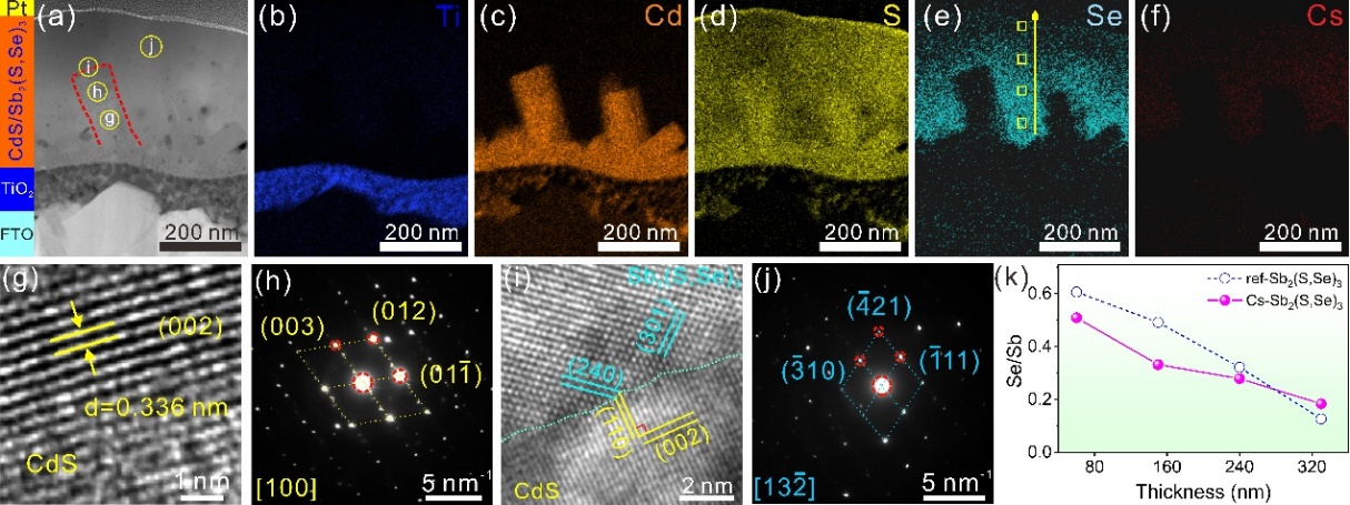 图1. Sb2(S,Se)3异质结薄膜中元素分布、晶格条纹间距及Se/Sb原子比变化