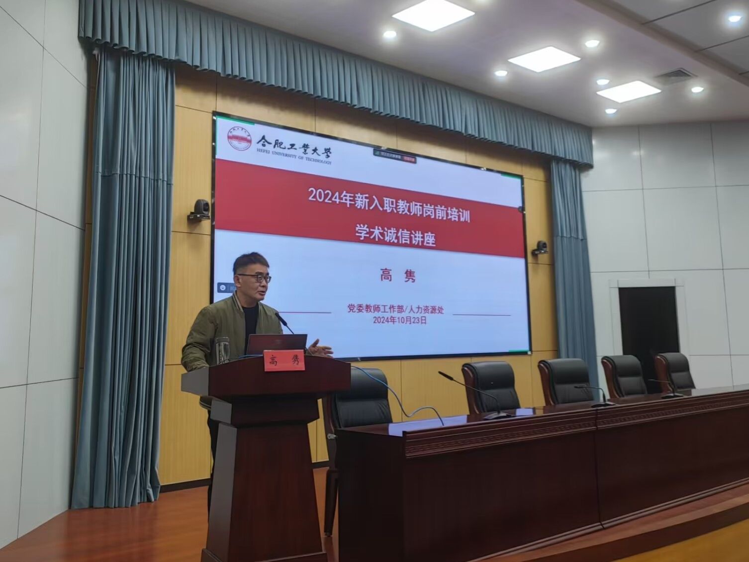 2024年10月23日晚,在2024年新入职教师岗前培训中,校学术委员会副主任兼秘书长高隽教授为新入职教师作了“学术诚信宣传教育”讲座。